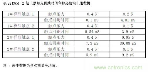 觸點(diǎn)接觸電阻包括動(dòng)合點(diǎn)接觸電阻和靜合點(diǎn)接觸電阻,是繼電器最重要的參數(shù)之一,也是最難測(cè)的參數(shù)的之一。圖3顯示了對(duì)繼電器觸點(diǎn)進(jìn)行四線凱爾文測(cè)試的原理。說(shuō)其難測(cè)是因?yàn)榻佑|電阻只有幾十毫歐、十幾毫歐,甚至只有幾毫歐,如果不是全線采取四線凱爾文測(cè)試,扣除測(cè)試系統(tǒng)的內(nèi)部電阻和接觸電阻則很難將其測(cè)準(zhǔn)。說(shuō)其重要是因?yàn)橛|點(diǎn)接觸電阻除了反映觸點(diǎn)的電性能(電阻)以外,還反映了觸點(diǎn)的化學(xué)和物理性能,例如觸點(diǎn)表面是否有鈍化膜產(chǎn)生,觸點(diǎn)間的壓力是否能達(dá)到設(shè)計(jì)要求。試驗(yàn)證明當(dāng)繼電器中的彈性材料應(yīng)力減退,觸點(diǎn)壓力下降將會(huì)在觸點(diǎn)接觸電阻參數(shù)上有明顯的反映,所以觸點(diǎn)接觸電阻與繼電器的接觸可靠性密切相關(guān)。表2顯示了繼電器樣品在試驗(yàn)中觸點(diǎn)接觸電阻和觸點(diǎn)壓力之間的關(guān)系。