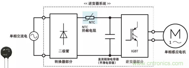 逆變器系統(tǒng)主要由轉換器級、逆變器級和直流側電容(平滑電容)組成,該電容放置在轉換器級之后,如下所示。上電時,器件會通過沖擊電流進行充電,而該沖擊電流的峰值是(為直流側電容充電的)穩(wěn)定電流的若干倍。該沖擊電流可能會對直流電容的使用壽命產(chǎn)生不利影響,或損壞半導體器件。為了防止沖擊電流,我們需要連接NTC熱敏電阻。