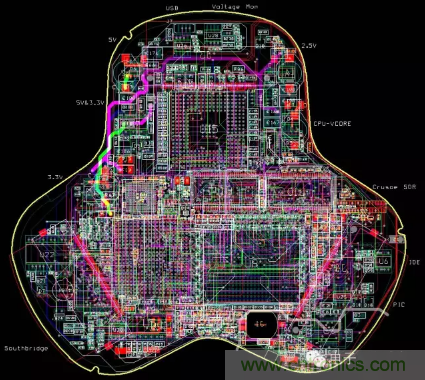 圖4 這片掌上電腦的12層電路板原型看起來(lái)很厲害,但是因?yàn)樽詣?dòng)布線器搞砸了PCI總線的時(shí)序,根本無(wú)法運(yùn)作。