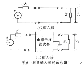 e是噪聲信號發(fā)生器,Zi是信號源的內(nèi)部阻抗,ZL是負載阻抗,一般取50Ω。噪聲頻率范圍可選10kHz~30MHz。首先要在不同頻率下分別測出插入前后負載上的噪聲壓降V1、V2,再代入(2)式中計算出每個頻率點的AdB值,最后繪出插入損耗曲線。需要指出,上述測試方法比較煩瑣,每次都要拆裝EMI濾波器。為此可用電子開關(guān)對兩種測試電路進行快速切換。