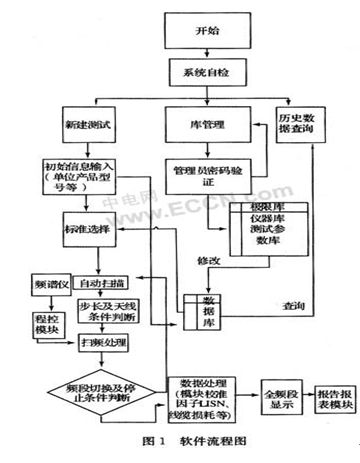 b.軟件構(gòu)成及功能:本軟件功能采用模塊化方法實(shí)現(xiàn)主要由界面參數(shù)輸入及數(shù)據(jù)顯示模塊、數(shù)據(jù)庫(kù)管理模塊、程控及自檢模塊、報(bào)告報(bào)表模塊組成。本EMI標(biāo)準(zhǔn)自動(dòng)測(cè)試軟件具備以下功能:①參數(shù)設(shè)置,包括測(cè)試標(biāo)準(zhǔn)的選擇,測(cè)試配置的提示,測(cè)試參數(shù)的設(shè)置,如測(cè)試頻段、測(cè)量帶寬、檢波方式、掃頻步進(jìn)量、參考電平、分辨率帶寬、掃頻方式、傳感器系數(shù)、電纜損耗、衰減/放大器等;②控制儀器(頻譜分析儀)以一定的步長(zhǎng)和速率對(duì)信號(hào)進(jìn)行掃頻測(cè)量、判別和讀出數(shù)據(jù);③數(shù)據(jù)處理能力.電磁輻射自動(dòng)測(cè)量軟件能夠自動(dòng)將測(cè)量的信號(hào)電壓轉(zhuǎn)換成干擾的量值,即自動(dòng)補(bǔ)償因傳感器的使用而引起的隨頻率變化的校準(zhǔn)系數(shù),并可用線性或?qū)?shù)頻率坐標(biāo)顯示出信號(hào)的頻率分布,同時(shí)自動(dòng)與相應(yīng)極限值進(jìn)行比較,判別信號(hào)是否超標(biāo)并在圖中表示出信號(hào)頻譜與極限值的關(guān)系;④數(shù)據(jù)的存儲(chǔ)和輸出能力,軟件可以將每次的測(cè)量數(shù)據(jù)以數(shù)據(jù)庫(kù)文件的形式進(jìn)行保存,需要時(shí)提取,特別是傳感器系數(shù)和測(cè)試極限值都以數(shù)據(jù)文件的形式保存,便于數(shù)據(jù)處理和查詢時(shí)調(diào)用。⑤數(shù)據(jù)庫(kù)管理功能。主要對(duì)各標(biāo)準(zhǔn)的極限值,天線校準(zhǔn)因子等進(jìn)行數(shù)據(jù)管理。系統(tǒng)工作流程圖如圖1所示。