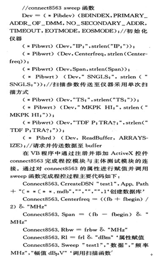 程控及系統(tǒng)自檢模塊均由VC++以控件形式實(shí)現(xiàn)。由于本系統(tǒng)使用的是NI公司的GPIB總線實(shí)現(xiàn)通信所以在VC++編程環(huán)境中,通過(guò)調(diào)用GPIB32.dll動(dòng)態(tài)連接庫(kù)使用其內(nèi)部函數(shù)完成通信,儀器指令參照HP 8563EC編程指令編制主要代碼如下: