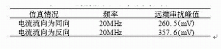 表1 電流流向不同時(shí)的串?dāng)_峰值