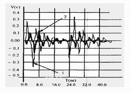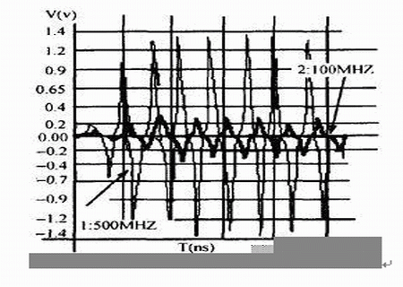 干擾源信號(hào)頻率越高,被干擾對(duì)象上的串?dāng)_幅值越大,我們對(duì)圖1中干擾源網(wǎng)絡(luò)AB上的信號(hào)頻率f1分別取不同頻率值時(shí),對(duì)被干擾對(duì)象上的串?dāng)_進(jìn)行了仿真,仿真結(jié)果見(jiàn)表2,信號(hào)頻率不同時(shí)的串?dāng)_波形見(jiàn)圖5,標(biāo)記為“1”、“2”箭頭所指的波形頻率分別為“500MHz”、“100MHz”。