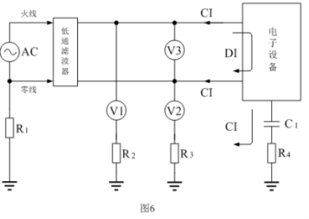 傳導(dǎo)干擾一般是通過電壓或電流的形式在電路中進(jìn)行傳播的,圖6是測(cè)試電子設(shè)備產(chǎn)生傳導(dǎo)干擾的基本方法,或表示傳導(dǎo)干擾通過電源線傳輸?shù)膸追N方式。圖6中,電子設(shè)備表示干擾信號(hào)源,CI表示共模干擾信號(hào),DI表示差模干擾信號(hào);V1、V2、V3分別表示用儀表對(duì)干擾信號(hào)進(jìn)行測(cè)量的連接方法,低通濾波器是為了便于對(duì)V1、V2、V3進(jìn)行測(cè)試,而另外加接進(jìn)去的;R1、R2、R3、R4分別為各電子設(shè)備的接地電阻,也包括大地之間的電阻,接地電阻一般為幾歐姆到幾十歐姆,其阻值與地線的安裝和地表面土壤結(jié)構(gòu)有關(guān);C1為電子設(shè)備對(duì)大地的電容,其容量與電子設(shè)備的體積還有地面距離有關(guān),一般為幾微微法到幾千微微法。從圖6中我們可以看出: