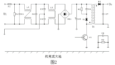 圖1 是一個(gè)普遍應(yīng)用的反激式(或稱為回掃式)開關(guān)電源工作原理圖,50Hz 或60Hz 交流電網(wǎng)電壓首先經(jīng)整流堆整流,并向儲(chǔ)能濾波電容器C5 充電,然后向變壓器T1與開關(guān)管V1組成的負(fù)載回路供電。圖2 是進(jìn)行過電磁兼容設(shè)計(jì)后的電原理圖。