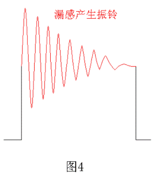 由于變壓器的初級有漏感,當(dāng)電源開關(guān)管V1由飽和導(dǎo)通到截止關(guān)斷時(shí)會(huì)產(chǎn)生反電動(dòng)勢,反電動(dòng)勢又會(huì)對變壓器初級線圈的分布電容進(jìn)行充放電,從而產(chǎn)生阻尼振蕩,即產(chǎn)生振鈴,如圖4所示。變壓器初級漏感產(chǎn)生反電動(dòng)勢的電壓幅度一般都很高,其能量也很大,如不采取保護(hù)措施,反電動(dòng)勢一般都會(huì)把電源開關(guān)管擊穿,同時(shí)反電動(dòng)勢產(chǎn)生的阻尼振蕩還會(huì)產(chǎn)生很強(qiáng)的電磁輻射,不但對機(jī)器本身造成嚴(yán)重干擾,對機(jī)器周邊環(huán)境也會(huì)產(chǎn)生嚴(yán)重的電磁干擾。