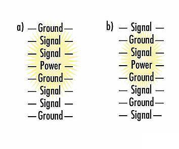 由於信號層和回路層之間總是隔有絕緣層,在10層板設(shè)計中分配中間6層來走信號線的方案并非最佳。另外,讓信號層與回路層相鄰很重要,即板布局為信號、地、信號、信號、電源、地、信號、信號、地、信號。