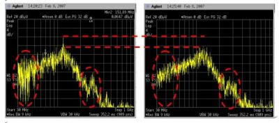圖1.D類系統(tǒng)的近場(chǎng)EMI測(cè)量結(jié)果。從紅色的虛線可看出左邊的固定頻率時(shí)鐘方案和右邊的擴(kuò)展頻譜調(diào)制之間的分別。