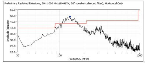 圖3.沒(méi)有邊沿速率控制的擴(kuò)展頻譜D類放大器。器件在EMI測(cè)試中,在沒(méi)有使用任何濾波器的情況下驅(qū)動(dòng)20英寸長(zhǎng)的揚(yáng)聲器電纜,其結(jié)果符合FCCB級(jí)的EMI限制。