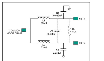 此類D類放大器對輸出濾波器的要求,不同于具有傳統(tǒng)差分輸入和互補(bǔ)PWM輸出的放大器。與PWM相比,MAX9704調(diào)制方案的輸出往往含有較高的共模信號,設(shè)計(jì)輸出濾波器時(shí)需要考慮這點(diǎn)。正如后面的實(shí)例所示,傳統(tǒng)差分濾波器拓?fù)浣Y(jié)構(gòu)的效果往往不太理想。