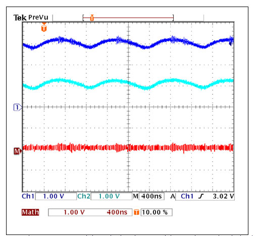 圖7.用MAX9704驅(qū)動(dòng)圖5a電路時(shí)FILT1和FILT2上產(chǎn)生的信號波形(同時(shí)顯示在頂部的跡線),以及差分輸出(底部的跡線)。