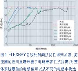 物理層應用指南明確指出了對FlexRay網(wǎng)絡數(shù)據(jù)線扼流圈的總體要求,比如引線電阻(<1W)、電感(>50mH)以及雜散電感(<1mH)。對電磁輻射和電磁干擾的測定與CAN總線一樣。不過,由于10Mbit/s的更高傳輸率,需要更加仔細地檢查信號完整性。圖4所示為對具有各種電感的扼流圈與不使用扼流圈的測試板進行DPI測定的相應評估結果。圖五所示為使用另一塊測試板進行電磁干擾測量的結果,同樣是針對具有不同電感的扼流圈。很明顯可以發(fā)現(xiàn),數(shù)據(jù)線扼流圈的使用改善了電磁兼容性并減少了干擾輻射。當電感更高時,作用就更大。不過,更高的電感值會對信號完整性產(chǎn)生一定的負面影響。[page]