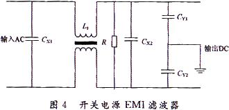 濾波是抑制傳導(dǎo)干擾的一種很好的辦法。在電源輸入端接上濾波器,即可以抑制開關(guān)電源產(chǎn)生并向電網(wǎng)反饋的干擾,也可以抑制來(lái)自電網(wǎng)的噪聲對(duì)電源本身的侵害。開關(guān)電源的工作頻率一般在10~130kHz,對(duì)開關(guān)電源產(chǎn)生的高頻段EMI信號(hào),只要選擇相應(yīng)的去耦電路或網(wǎng)絡(luò)結(jié)構(gòu)較為簡(jiǎn)單的EMI濾波器,就能達(dá)到理想的濾波效果。干擾抑制電路如圖4所示,CX1和CX2叫做差模電容,L1叫做共模電感,CY1和CY2叫做共模電容。電阻R用于消除可能在濾波器中出現(xiàn)的靜電積累。IEC-380安全技術(shù)條件標(biāo)準(zhǔn)的8.8部分指出,若CX>0.1μF則R=t/2.2C(t=1s,C=2CXμF)。