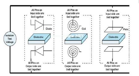 三個主要標(biāo)準(zhǔn)驗證了對于隔離保護(hù)的必要性,其分別為UL1577、IEC60747-5-2和CSA。雖然每一種標(biāo)準(zhǔn)都稍有不同,但是均提供了一個對比隔離性能的標(biāo)準(zhǔn)。IEC、UL和CSA的測試證實了輸入和輸出之間電介質(zhì)擊穿以外的電壓。運用這些標(biāo)準(zhǔn)非常簡單,因為測試標(biāo)準(zhǔn)和隔離方法無關(guān)。圖10顯示了隔離測試是如何將隔離器看作是兩端器件的。盡管每種器件的物理結(jié)構(gòu)存在差異,但隔離測試卻是在電介質(zhì)擊穿電壓上測定的。