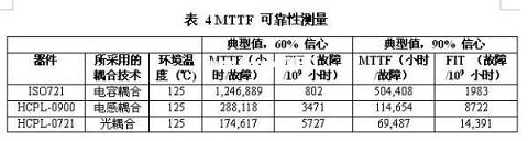 故障前平均工作時間(MTTF)是半導(dǎo)體設(shè)備可靠性的標(biāo)準(zhǔn)測量方法。對于數(shù)字隔離器而言,這種測量表示集成電路和隔離機(jī)制的可靠性。表4顯示了一款光、電感和電容數(shù)字隔離器的MTTF。與電感及光解決方案相比,ISO721非??煽?。