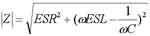 隨著電路系統(tǒng)時鐘頻率的增加,很多情況就不能按照理想的電容器來考慮了。一個實際的電容不論是陶瓷電容還是電解電容,都可以被簡化成一個串聯(lián)RLC的模型。一個電容模型包括自身的電容C,還包括了等效的串聯(lián)電感ESL和等效串聯(lián)電阻ESR這兩個重要的參數。這個串聯(lián)模型的阻抗幅值是: