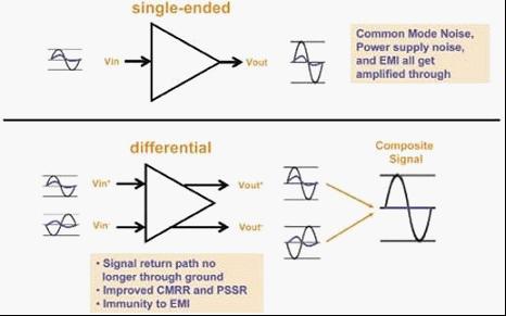 如圖2所示,單端信號(hào)會(huì)對(duì)共模噪聲、電源噪聲和電磁干擾比較敏感,運(yùn)放會(huì)對(duì)這些噪聲一定程度的放大。而差分信號(hào)由于兩側(cè)信號(hào)自身形成電流回路,抑制了共模噪聲和干擾,僅對(duì)差模信號(hào)進(jìn)行有效放大。