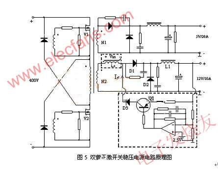 磁放大器穩(wěn)壓是利用可飽和電感導(dǎo)通延時(shí)的物理特性來(lái)控制開(kāi)關(guān)電源的占空比和輸出功率,穩(wěn)定電源輸出電壓的一種方法。在可飽和電感上加上適當(dāng)?shù)牟蓸雍涂刂圃?,調(diào)節(jié)其導(dǎo)通延時(shí)的時(shí)間,就可以構(gòu)成最常見(jiàn)的磁放大器穩(wěn)壓電路。圖5是一個(gè)輸入為110Vac~220Vac/50HZ,輸出為5Vdc/20A,12Vdc/10A的雙管正激開(kāi)關(guān)穩(wěn)壓電源,其中5V是主控回路。其輔路12V輸出電流較大,對(duì)穩(wěn)壓精度和負(fù)載穩(wěn)定度都有較高要求,采用普通的方法穩(wěn)壓效果都不是很理想,如果采用磁放大器穩(wěn)壓技術(shù)就可圓滿解決這一問(wèn)題,使穩(wěn)壓電路的結(jié)構(gòu)簡(jiǎn)單,耗散功率小,并可達(dá)到毫伏級(jí)的穩(wěn)壓精度。