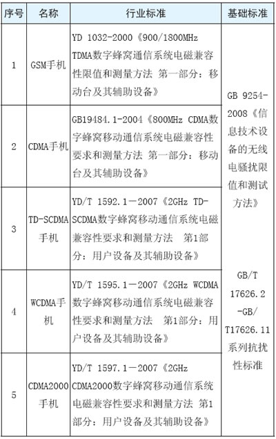 不同制式的手機電磁兼容測試時,選擇不同的行業(yè)標準,依據(jù)的基礎(chǔ)標準相同,見下表1。