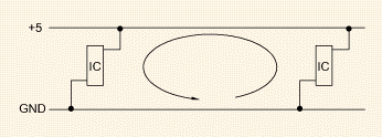 電流通過(guò)感應(yīng)進(jìn)入到電路環(huán)路,這些環(huán)路是封閉的,并具有變化的磁通量。電流的幅度與環(huán)的面積成正比。較大的環(huán)路包含有較多的磁通量,因而在電路中感應(yīng)出較強(qiáng)的電流。因此,必須減少環(huán)路面積。