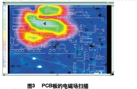 利用電磁輻射掃描儀,對(duì)裝聯(lián)并上電后的機(jī)盤(pán)掃描,得到PCB中電磁場(chǎng)分布圖(如圖3,圖中紅色、綠色、青白色區(qū)域表示電磁輻射能量由低到高),根據(jù)測(cè)試結(jié)果改進(jìn)PCB設(shè)計(jì)。
