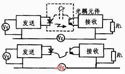 用光傳輸信號(hào)是解決地環(huán)路問題的理想方法。如圖3所示,光耦器件的寄生電容為2 pF左右,因此能夠在很高的頻率起到隔離作用。如果使用光纖,則沒有寄生電容的問題,能夠獲得十分完善的隔離效果。但是,用光纖會(huì)帶來其它問題,如:需要更大的功率、需要更多的外圍器件,光連接的線形和動(dòng)態(tài)范圍都達(dá)不到模擬信號(hào)的要求、光纜的安裝和維護(hù)比較復(fù)雜等,使用時(shí)應(yīng)注意。