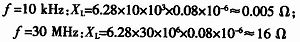 當(dāng)一段導(dǎo)線與其他導(dǎo)線遠(yuǎn)離并且其長(zhǎng)度遠(yuǎn)大于寬度時(shí),導(dǎo)線的自感量為0.8 μH/m,那么10 cm長(zhǎng)的導(dǎo)線的電感量是0.08μH。再由下面的公式求出導(dǎo)線感抗:XL=2πfL,下式中,f為導(dǎo)線通過信號(hào)的頻率(Hz),L為單位長(zhǎng)度導(dǎo)線的自感量(H)。所以分別計(jì)算出該導(dǎo)線在低頻和高頻下的感抗值: