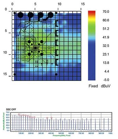 該公司期望用令人信服的量化證據(jù)來(lái)向汽車廠商說(shuō)明SSCG功能可以有效降低EMI輻射。為了實(shí)現(xiàn)這個(gè)目標(biāo),設(shè)計(jì)團(tuán)隊(duì)首先在SSCG功能為“關(guān)”的情況下將待測(cè)器件(DUT)放其內(nèi)部掃描儀上,加電,然后在PC中捕獲輻射特性。為了進(jìn)行有效的對(duì)比,在打開SSCG功能的情況下,對(duì)同一待測(cè)器件進(jìn)行了掃描。