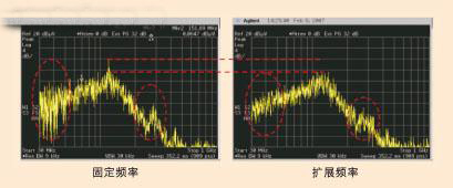 從圖中可見,在處理D類固有的周期性方波時,最基本的難題是諧振間隔時出現(xiàn)的集中能量。為了設計一個“安靜”的低EMI D類放大器,一個方法是將頻率來回抖動,或擴展開關的頻譜,降低頻譜內所有點上的能量。與傳統(tǒng)的D類放大器相比,擴頻調制方案有幾個重要的優(yōu)點:除了可保持高效效率和低THD+N外,更重要的是大幅削減了輻射噪聲和EMI,如圖6中所示。