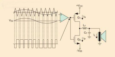 由于自身的效率很高,D類音頻放大器很快就在消費電子設備中獲得了廣泛的應用。D類音頻放大器通過輸入的模擬信號來調制一個高頻方波,該方波的頻率可以是固定的也可以是可變的,甚至可以是隨機脈沖。低通濾波器用來過濾信號中的高頻內容以及恢復原始音頻信號。在沒有濾波器的拓樸中,揚聲器本身的電感會被合并成濾波器的一部份。脈沖寬度調制(PWM)是一種普遍的D類拓樸技術,它采用固定頻率的波形,并通過改變工作周期在低通濾波器后面產(chǎn)生出一個移動平均信號(圖4)。