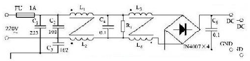 采用無源的EMI濾波器是抑制傳導(dǎo)干擾最有效的辦法。即在電路中插入一個(gè)帶通濾波器,讓50 Hz交流電暢通,其余頻率的信號(hào)受阻。但要嚴(yán)格控制濾波器LC元件的寄生參數(shù),它們的制作工藝、安裝位置、走線方式,都會(huì)影響EMI濾波效果。加接圖1所示的濾波電路,可以控制通過傳導(dǎo)耦合進(jìn)入電網(wǎng)的噪聲電平。