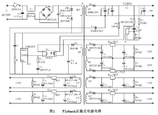 輸入為交流220V,經(jīng)功率二極管整流橋變?yōu)橹绷髯鳛榉醇ぷ儞Q器的輸入,輸出為三組直流:+5V,15V,12V,另外有一輔助電源5V,用來(lái)給光耦PC817供電??刂齐娐酚梅答伩刂?,選用TOPSwicth系列的TOP223Y芯片。