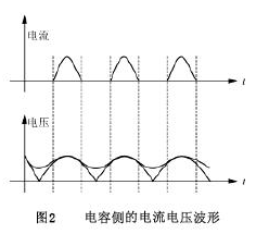 本電路中,交流輸入電壓Ui經(jīng)功率二極管整流橋變?yōu)檎颐}動(dòng)電壓,經(jīng)電容C12平滑后變?yōu)橹绷?,但電容電流的波形不是正弦波而是脈沖波。如圖2所示?! ?br />