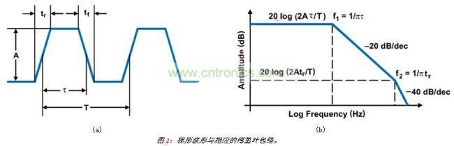 對于CCM中運作的降壓轉(zhuǎn)換器,電感電流一直是非零的正電流。在這種情況下,負(fù)載周期為D=Vout/Vin,在本例中為38%(5V/14V)。使用200kHz的開關(guān)頻率時,我們很快計算出導(dǎo)通時間為1.8μs。為支持此頻率,控制開關(guān)的上升/下降時間必須小于90納秒。這使得我們注意到第一個減少噪聲的方法,也就是斜率控制。您可能還無法理解,但是此時我們非常了解與PWM切換節(jié)點有關(guān)的諧波,也就是開關(guān)穩(wěn)壓器的控制波形。如果將此波形以圖1(a)中所示的梯形表示,波形的諧波便能夠以圖1(b)中的內(nèi)容表示,這表明了EMI背后的驅(qū)動因素。這一傅里葉包絡(luò)定義了可通過傅里葉分析或計算梯形波形導(dǎo)通時間及上升時間取得的諧波振幅。