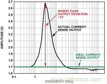 這種情況下,40 MHz時誤差僅為3 mV左右,且峰值誤差(大于100 MHz時)小于30 mV,性能提高35倍。這點清楚地表明,內(nèi)置EMI濾波電路有助于顯著提高電流傳感器防護(hù)性能,使其免受輸入端存在的高頻信號影響。在實際應(yīng)用中,盡管并不清楚EMI的嚴(yán)重程度,但是如果使用內(nèi)置EMI濾波功能的電流傳感器,實際上控制環(huán)路將會保持在其容差范圍內(nèi)。