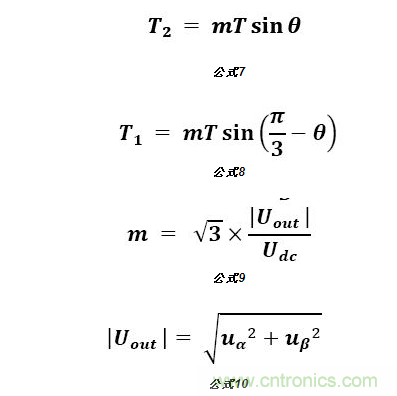 由此可知SVPWM實現(xiàn)步驟:先通過Uout判斷出電壓矢量所在扇區(qū),再根據(jù)相鄰的電壓矢量及Uout計算出兩個基本矢量作用時間;最后根據(jù)兩個基本矢量作用時間計算出PWM開關(guān)時間及占空比。