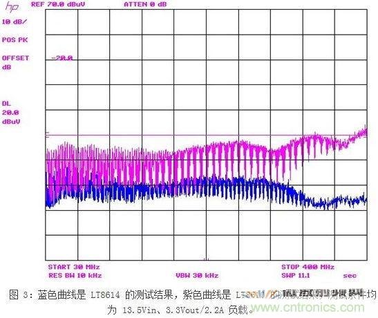 圖2所示測量結(jié)果是在電波暗室和以下條件下取得的:12Vin、3.3Vout/2A,固定開關(guān)頻率為700kHz