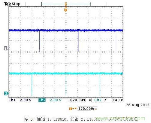 圖 5顯示了13.2V輸入的開關(guān)節(jié)點(diǎn)??梢钥吹?,LT8614與理想方波的偏離極小,如通道2所示。圖3、4和5中的所有時(shí)間域測量結(jié)果都是用 500MHzTektronixP6139A探頭測得的,封閉的探頭尖端屏蔽罩連接至PCBGND平面,測試均在標(biāo)準(zhǔn)演示電路板上進(jìn)行。[page]
