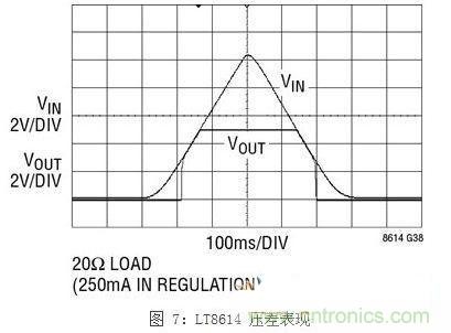除了面向汽車環(huán)境的42V絕對最大輸入電壓額定值,器件的壓差表現(xiàn)也非常重要。常常需要支持至關(guān)重要的3.3V邏輯電源以應(yīng)對冷車發(fā)動情況。在這種情況 下,LT8614SilentSwitcher穩(wěn)壓器保持接近LT861x系列的理想表現(xiàn)。LT8610/11/14器件不是像其他器件那樣提供更高的欠 壓閉鎖電壓和最大占空比箝位,而是以低至3.4V的電壓工作,而且只要有必要,就跳過若干周期,如圖6所示。這樣就產(chǎn)生了理想的壓差表現(xiàn),如圖7所示。