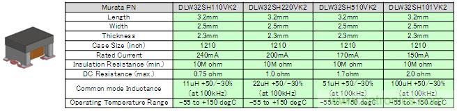 作為DLW43SH系列的小型化產(chǎn)品,DLW32SH系列目前正在開發(fā)中。該系列的外觀以及主要特性如圖3所示。DLW32SH系列的尺寸為3.2×2.5×2.3mm具有小尺寸特點,并且與DLW43SH系列相比,可實現(xiàn)同等性能。其構(gòu)造的特征是在產(chǎn)品端子部分使用了金屬支架,可以緩和由于溫度變化產(chǎn)生的熱伸縮影響,適用的溫度范圍達到了-55~+150℃。