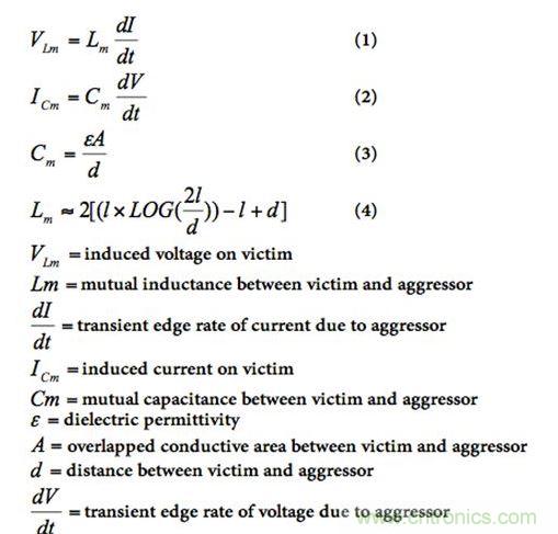 方程式(1)和(2)分別是入侵信號(hào)對(duì)受害信號(hào)的感應(yīng)電壓和電流計(jì)算公式,方程式(3)和(4)分別是入侵信號(hào)和受害信號(hào)之間的互電容和互電感計(jì)算公式。