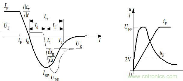 在開關電源中常使用工頻整流二極管、高頻整流二極管、續(xù)流二極管等,由于這些二極管都工作在開關狀態(tài),如圖所示,在二極管由阻斷狀態(tài)到導通工作過程中,將產(chǎn)生一個很高的電壓尖峰VFP;在二極管由導通狀態(tài)到阻斷工作過程中,存在一個反向恢復時間trr,在反向恢復過程中,由于二極管封裝電感及引線電感的存在,將產(chǎn)生一個反向電壓尖峰VRP,由于少子的存儲與復合效應,會產(chǎn)生瞬變的反向恢復電流IRP,這種快速的電流、電壓突變是電磁干擾產(chǎn)生的根源。