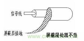 雙絞線、同軸電纜都能有效的抑制電磁干擾。在脈沖信號傳輸線路中常使用雙絞線,控制輔助電源線和傳感器信號線最好用雙絞屏蔽線。因為雙絞線兩根線之間有很小的回路面積,而且雙絞線的每兩個相鄰的回路上感應出的電流具有大小相等、方向相反,產(chǎn)生的磁場相互抵消,這樣就可以減小因輻射引起的差模干擾,不過雙絞線絞合的圈數(shù)最好為偶數(shù),且每單位波長所絞合的圈數(shù)愈多,消除耦合的效果愈好。使用時注意雙絞線和同軸電纜兩端不能同時接地,只能單端接地,而對屏蔽線,屏蔽層兩端接地能既能屏蔽電場還能屏蔽磁場,單端接地只能屏蔽電場。使用同軸電纜時還要注意,其屏蔽層必須完全包覆信號線接地,即接頭與電纜屏蔽層必須3600搭接,才能有效屏蔽電磁場,如圖4所示,信號線裸露部分仍可以與外界形成互容耦合,降低屏蔽效能。