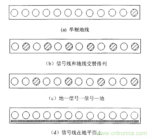 在設(shè)計(jì)的時(shí)候,也考慮過使用(b)信號(hào)線和地線交替排列和(c)地線—信號(hào)線—信號(hào)線—地線這兩種結(jié)構(gòu)。圖(b)是一個(gè)較好的配置,因?yàn)槊扛鶎?dǎo)線都緊挨著一個(gè)分離的地線,這種排列結(jié)構(gòu)帶來的好處就是,環(huán)路面積很小,公共阻抗耦合被消除額,并且所有導(dǎo)線之間的串?dāng)_被減到最小。