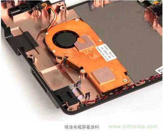 (2)在整個(gè)電子設(shè)備外殼就具有高電磁波發(fā)射能力的電路和器件周?chē)?,添加電磁波屏蔽罩、粘貼金屬箔、噴涂導(dǎo)電涂料、鍍一層導(dǎo)電金屬層、增加電磁波吸收材料。