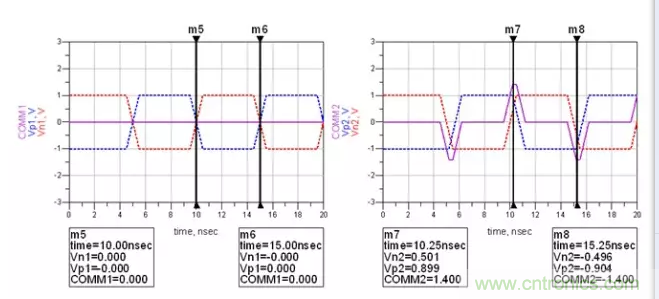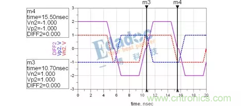 可以看到,兩次經過零軸的時間由之前的5ns變成了4.8ns?;蛘哒f,N與P的長度差,引起了0.04UI的抖動。這時候,串行的Clock recovery該花點心思才能將其時鐘解出來了。而且在進行時鐘與數(shù)據(jù)對位的時候,是對在0V這個階梯的左邊還是對在右邊呢?這又會引起時序問題的出現(xiàn)。
