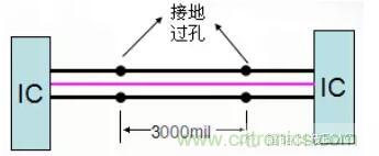 3、時鐘兩側(cè)建議包地線,包地線每隔3000mil接地,這樣保證包地線上各點(diǎn)電位相等。