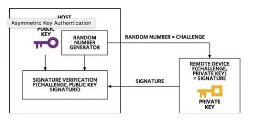 對稱加密安全認證依賴于共享密鑰。主機和被認證設(shè)備持有相同的密鑰。主機向設(shè)備發(fā)送一個隨機數(shù),即質(zhì)詢。設(shè)備計算一個數(shù)字簽名,該簽名是密鑰和質(zhì)詢的函數(shù),并發(fā)送回主機。主機執(zhí)行相同的運算并對結(jié)果進行比較。如果兩項計算結(jié)果一致,則設(shè)備通過安全認證(圖1)。為了確保結(jié)果不被模仿,必須使用數(shù)學(xué)屬性足夠的函數(shù);例如必須保證不可能通過計算結(jié)果獲得密鑰。SHA-256等安全散列函數(shù)滿足這些要求。對于質(zhì)詢-應(yīng)答方法,設(shè)備在不泄露密鑰的情況下證明自己知道密鑰。即使攻擊者攔截通信,也無法接觸到密鑰。