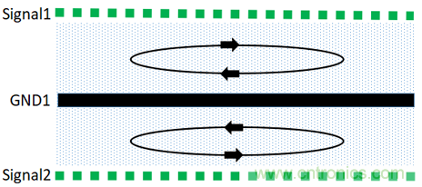 磁通對消的本質(zhì)就是信號回流路徑的控制,具體示意圖如下: